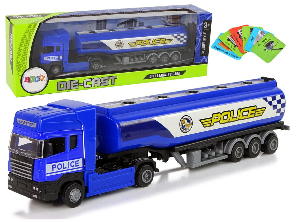 Modrá policejní cisternová souprava, délka 30 cm Je to ideální hračka pro každého milovníka speciálních služeb Spojuje cisternu a nákladní auto v jednom