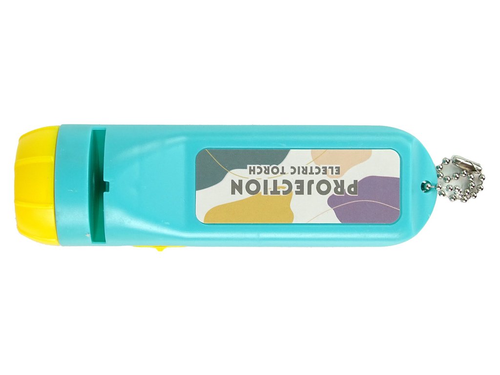 Modrý projektor na fotografie 24 obrázků Objevte malý modrý projektor o délce 12 cm, který je vybaven praktickým přívěskem, díky kterému jej můžete připevnit na batoh nebo jiné místo V sadě najdete 3 kolečka s obrázky, z nichž každé obsahuje 8 různých motivů: hmyz, dinosaury a ovoce