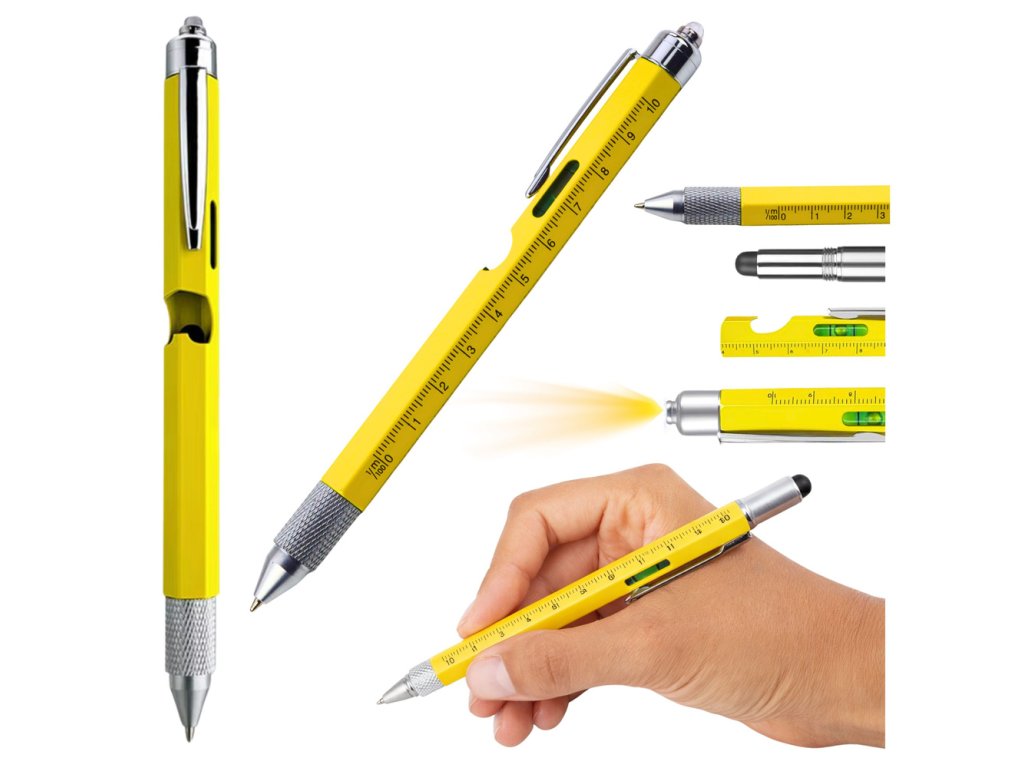 Objevte dokonale multifunkční nástroj, který spojí potřeby kanceláře i dílny v jednom kompaktním zařízení! Dlouhopis 8v1, v oslnivé žluté barvě, kombinuje funkci pera, úrovně, měřítka a dokonce i LED světlo. S kovovou konstrukcí a měděnými prvky je nejen stylový, ale i odolný, což z něj činí perfektní doplněk pro každý den. Nikdy nevíte, kdy budete potřebovat šroubovák – buďte připraveni s plochým i křížovým nástavcem vždy po ruce. Pokud si plánujete pauzu na limonádu, užijete si určitě i otvírák na lahve integrovaný v tomto geniálním nástroji. A to není vše! Tento šikovník vám také poslouží jako držák na telefon nebo stylus pro dotykové obrazovky.