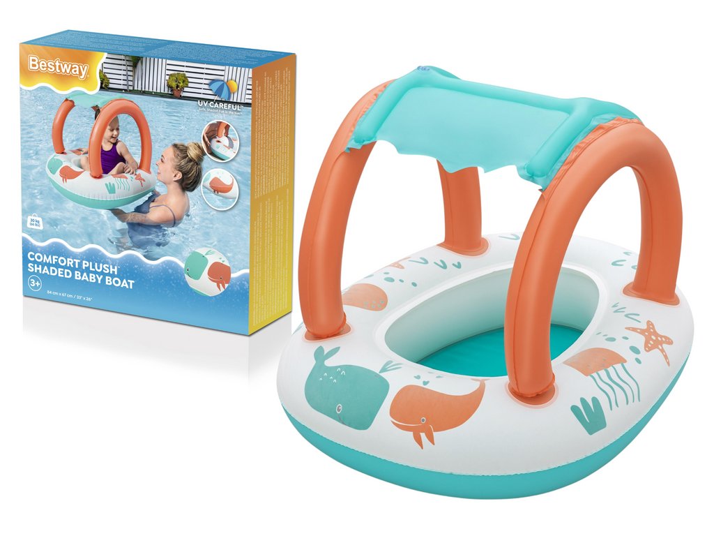 - Nafukovací člun s odnímatelnou stříškou UV Careful™ o rozměrech 84 x 67 cm od značky Bestway je ideální vodní hračka navržená pro nejmenší děti, které teprve začínají svou dobrodružnou cestu s vodou