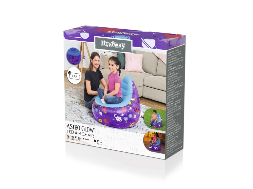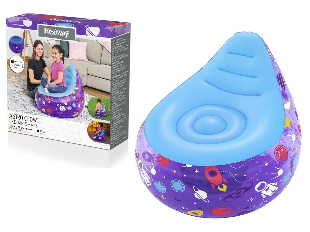 - Nafukovací křeslo Kosmos LED 72 x 72 x 64 Bestway 75122 Fialová Nafukovací křeslo je nejen snadno sestavitelné, ale také vyžaduje minimální prostor pro skladování, což z něj činí velmi praktické řešení