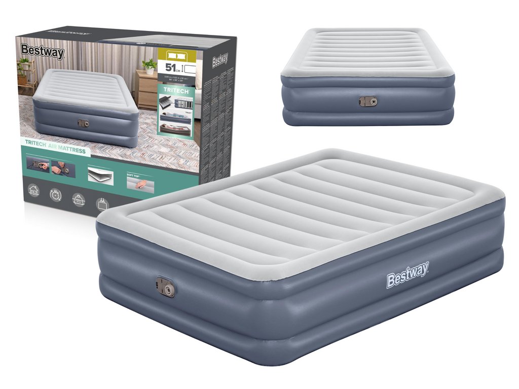 Nafukovací matrace Bestway je dvoulůžková postel s rozměry 203 x 152 x 51 cm, vybavena integrovanou elektrickou pumpou, což umožňuje rychlou a pohodlnou přípravu pro spánek Pohodlí a trvanlivost: Matrace je vyrobena z třívrstvého materiálu TRITECH™, který zaručuje pevnost a odolnost vůči deformacím, poskytující komfortní užívání po dlouhou dobu