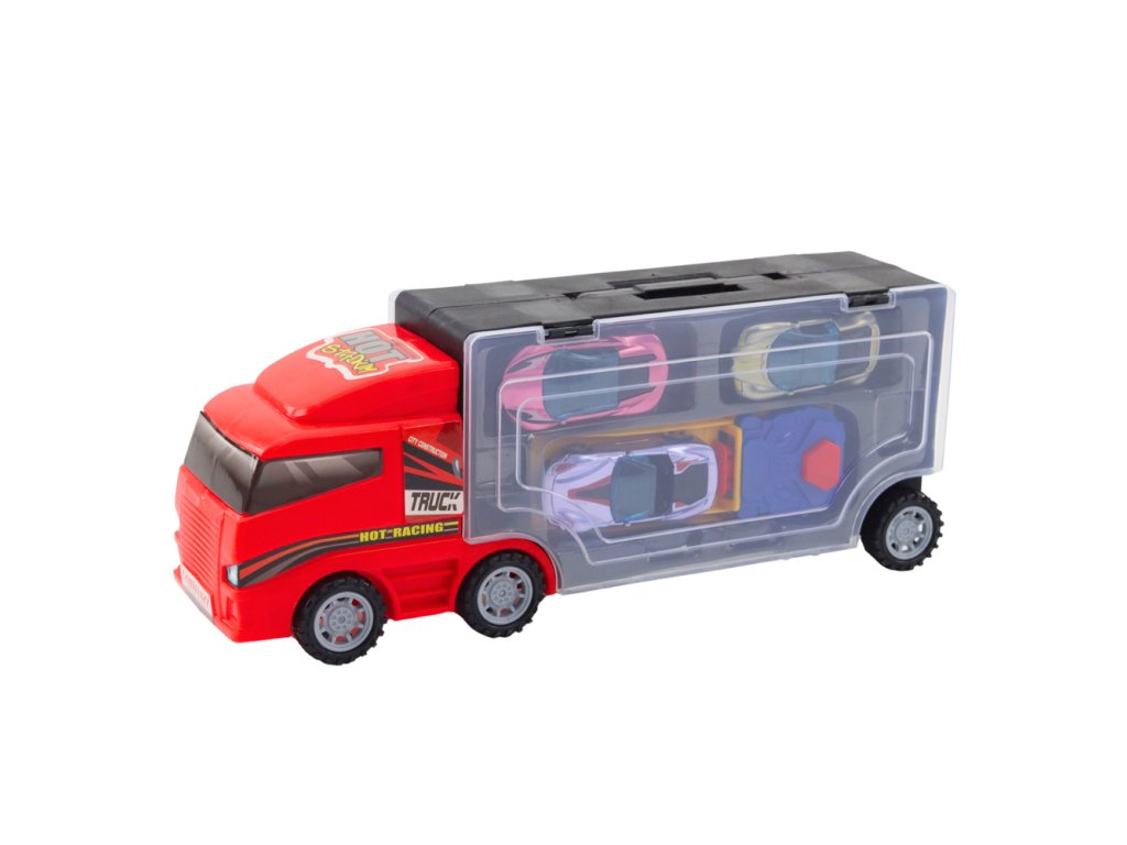 Díky průhlednému přívěsu může dítě snadno nahlédnout do obsahu nákladní auta a speciální přepážky pomáhají s organizací autíček i příslušenství, což usnadňuje používání hračky Pevná konstrukce a realistický vzhled dodávají nákladnímu autu vzhled skutečného dopravního vozidla