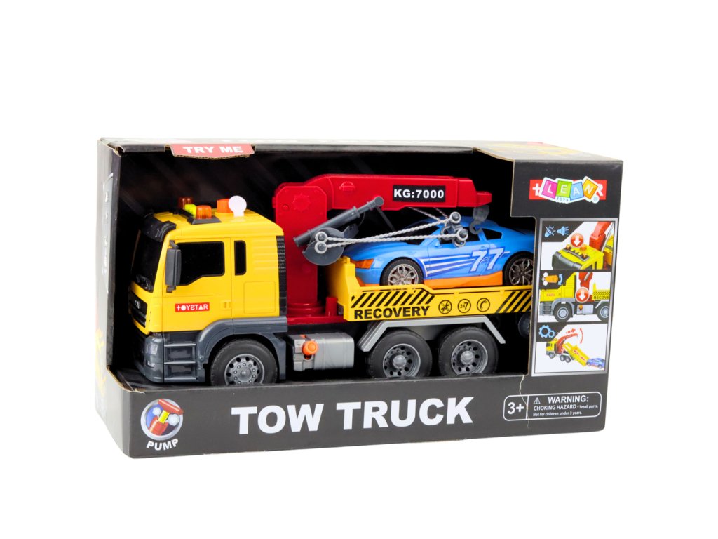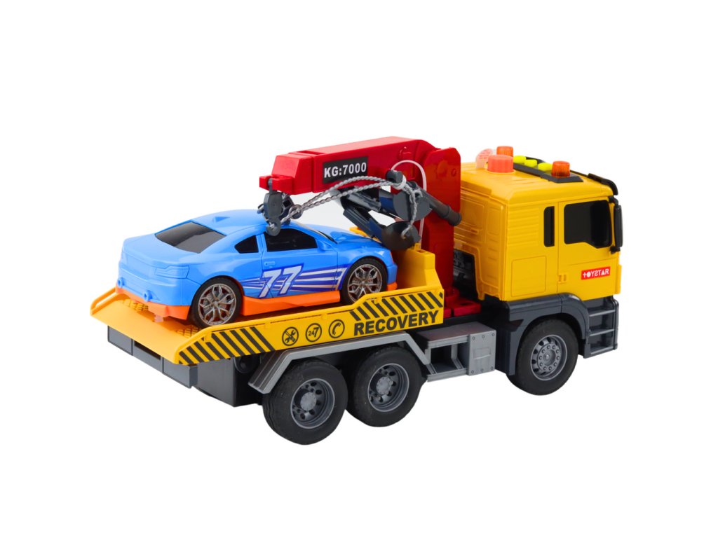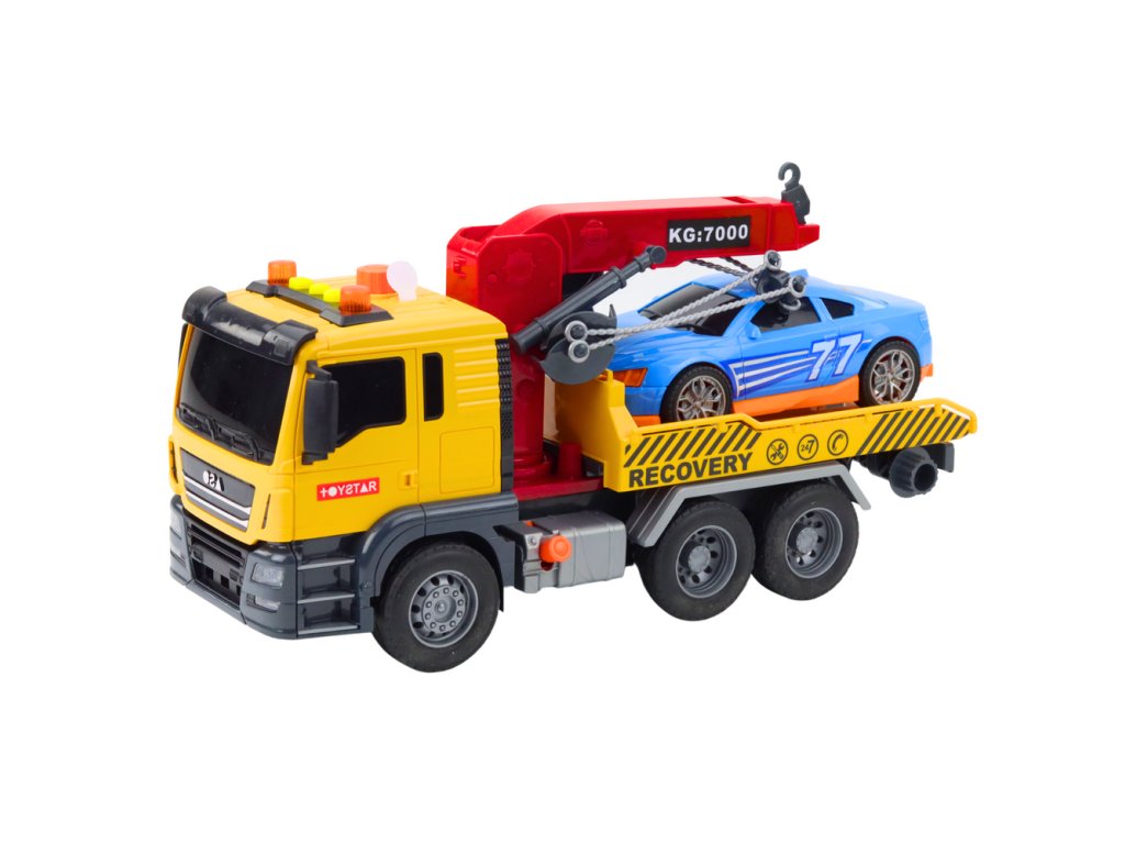Odtahový vůz s jeřábem, závodním autem, světly a zvuky
