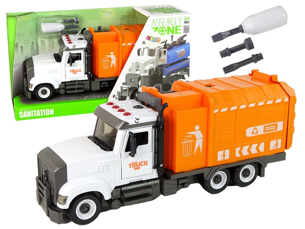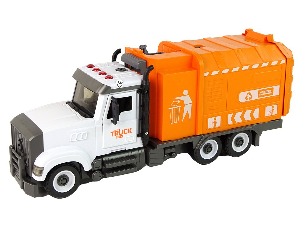 - Popelářské auto na rozebírání a skládání, doplňky, oranžové Jedná se o velmi interaktivní a realistickou hračku, která dětem umožní vžít se do role řidiče smetiště