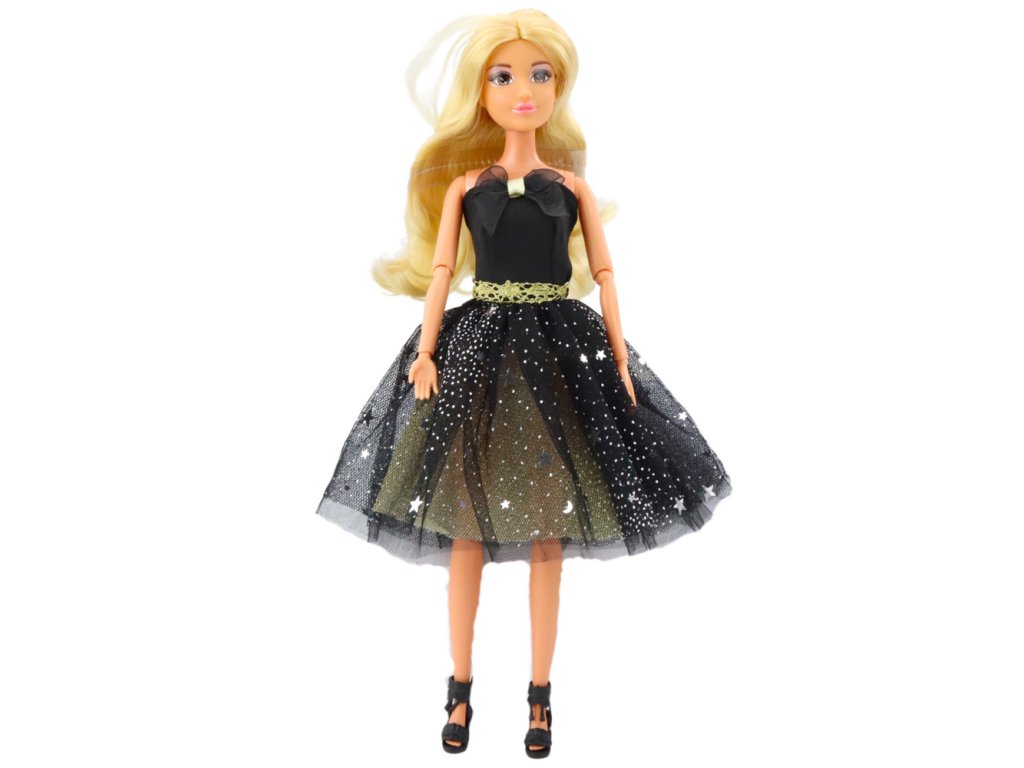 - Tato elegantní panenka ve stylových černých šatech s tylovou vrstvou zdobenou stříbrnými hvězdami a třpytkami zaujme na první pohled