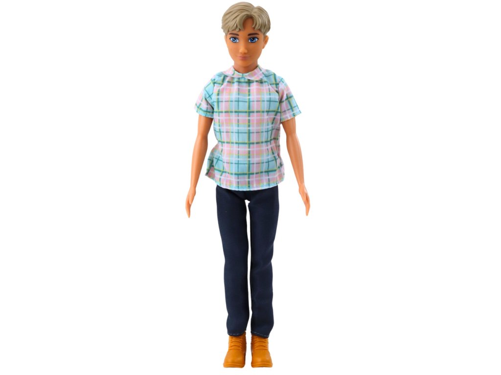 - Loutka chlapce je oblečena do barevné košile s kostkovaným vzorem, námořníckých kalhot a hnědých bot