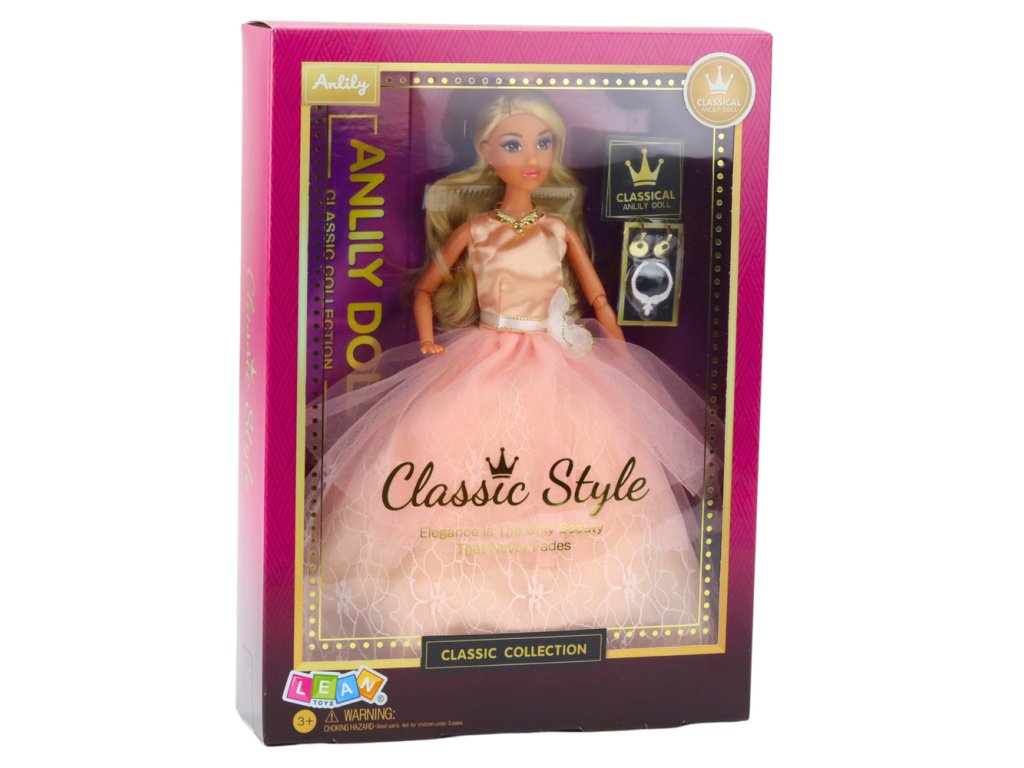 Loutka Anlily v pudrové plesové sukni je elegantní hračka, která okouzlí každou malou fanynku stylu a pohádkových příběhů.