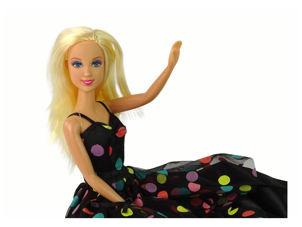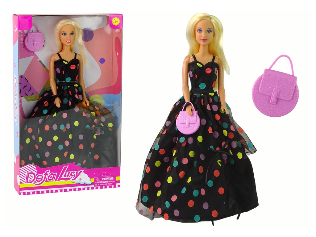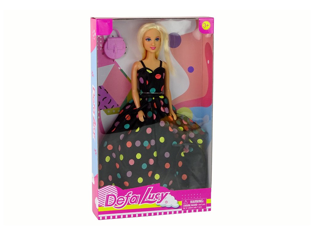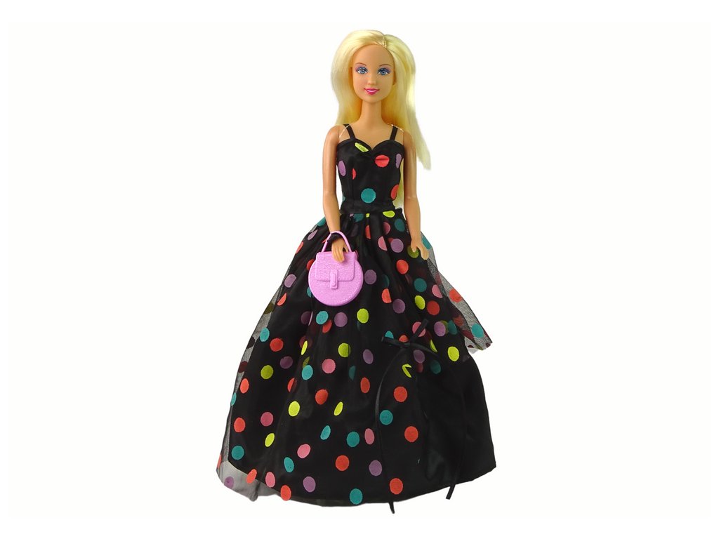 Panenka Lucy Šaty Černé Tečky Dlouhé Tato roztomilá panenka jménem Lucy má dlouhé, lesklé vlasy v krásném odstínu blond Její účes je jemně zvlněný, což jí dodává dívčí šarm