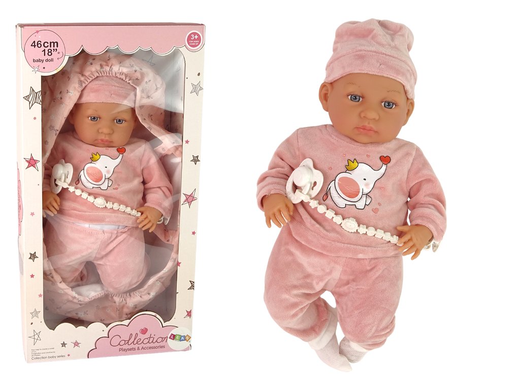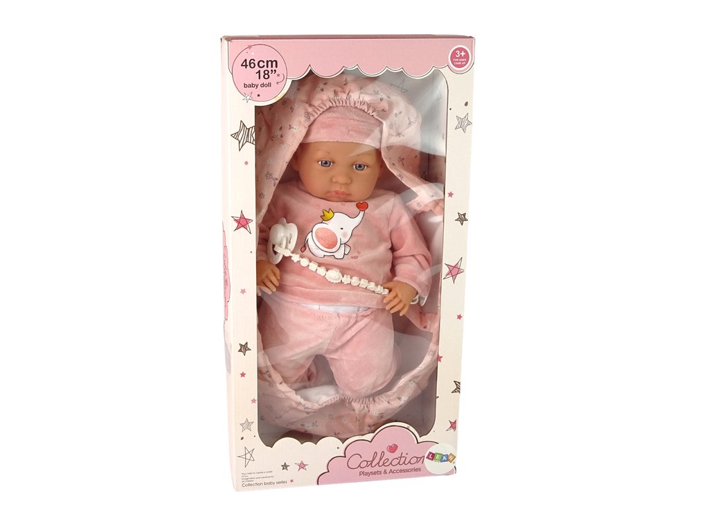 Panenka Bobas 46 cm růžová dudlík zavinovačka slon ⭐ Roztomilá panenka Bobas, která vypadá jako skutečné dítě, potěší každého malého človíčka.