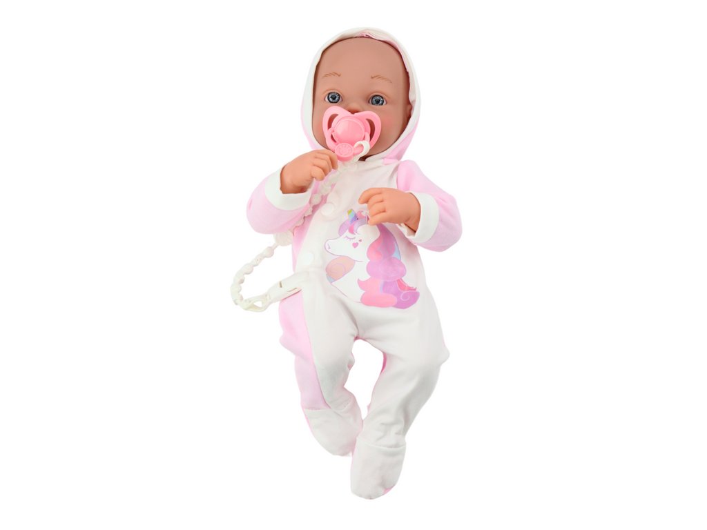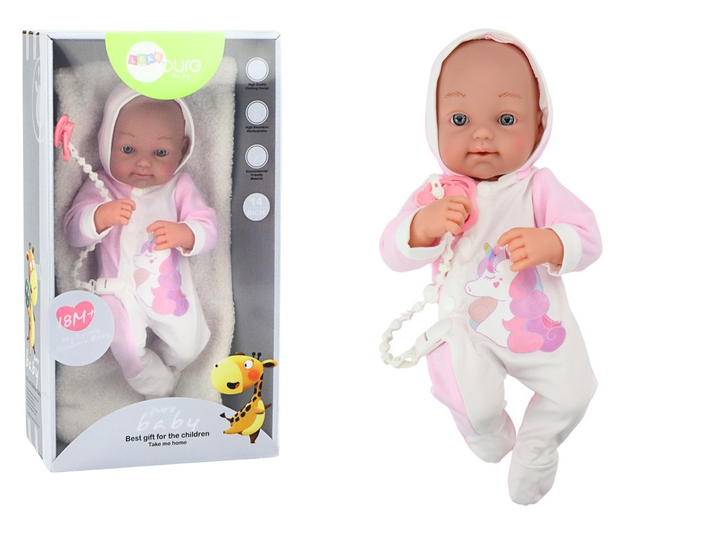 - Tato roztomilá panenka je oblečena v půvabném bílo-růžovém body s motivem jednorožce a je opatřena měkkou dekou