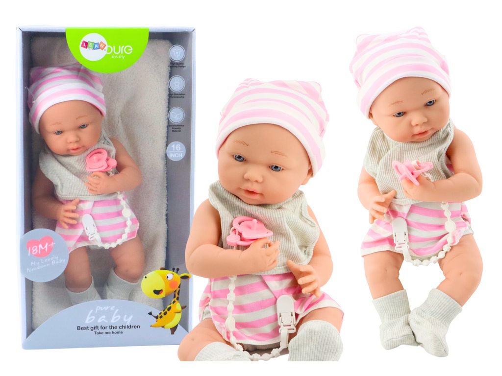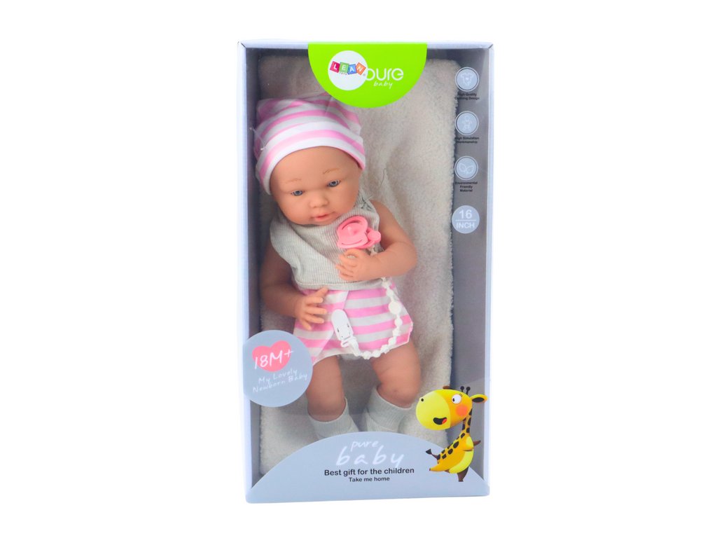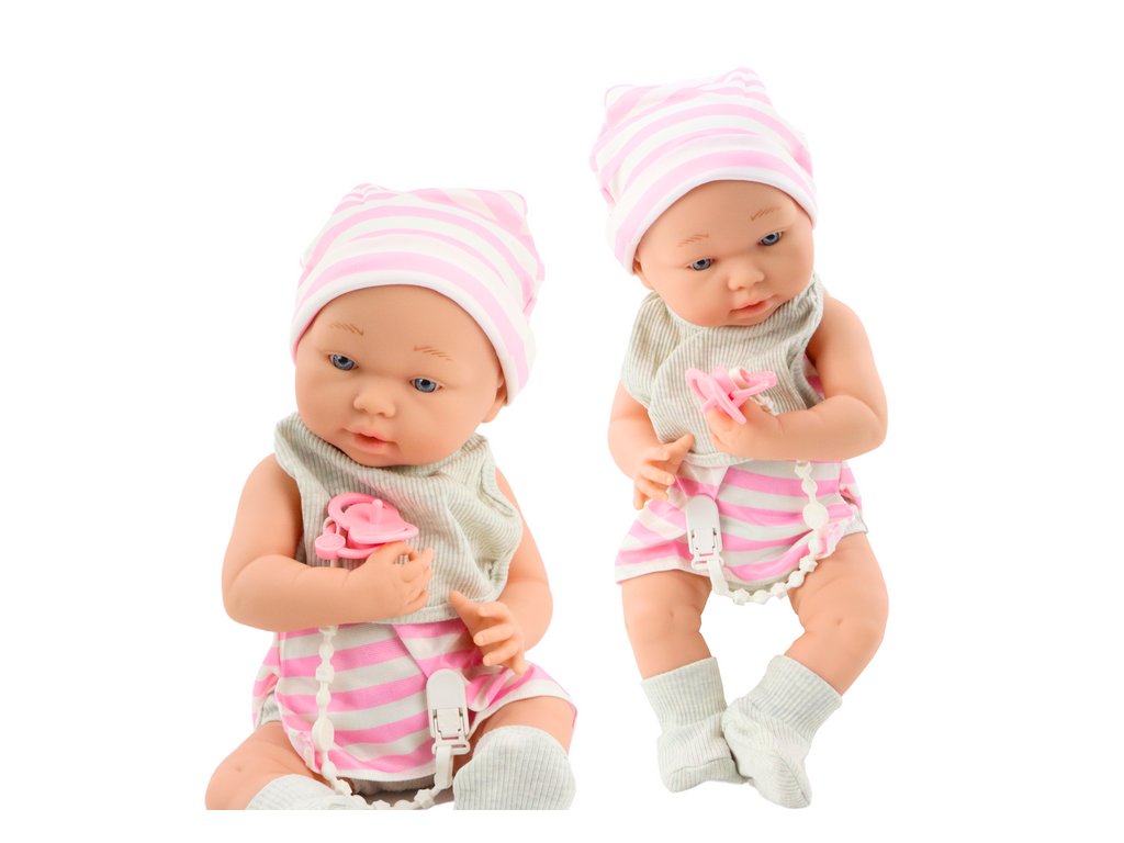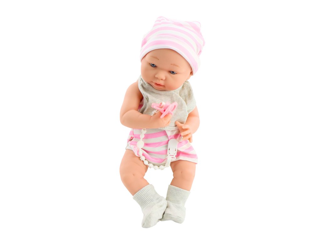 - Celá panenka je oděná v bílo-růžovém oblečku s ladícím bryndáčkem a čepičkou, která dodává neodolatelný šarm