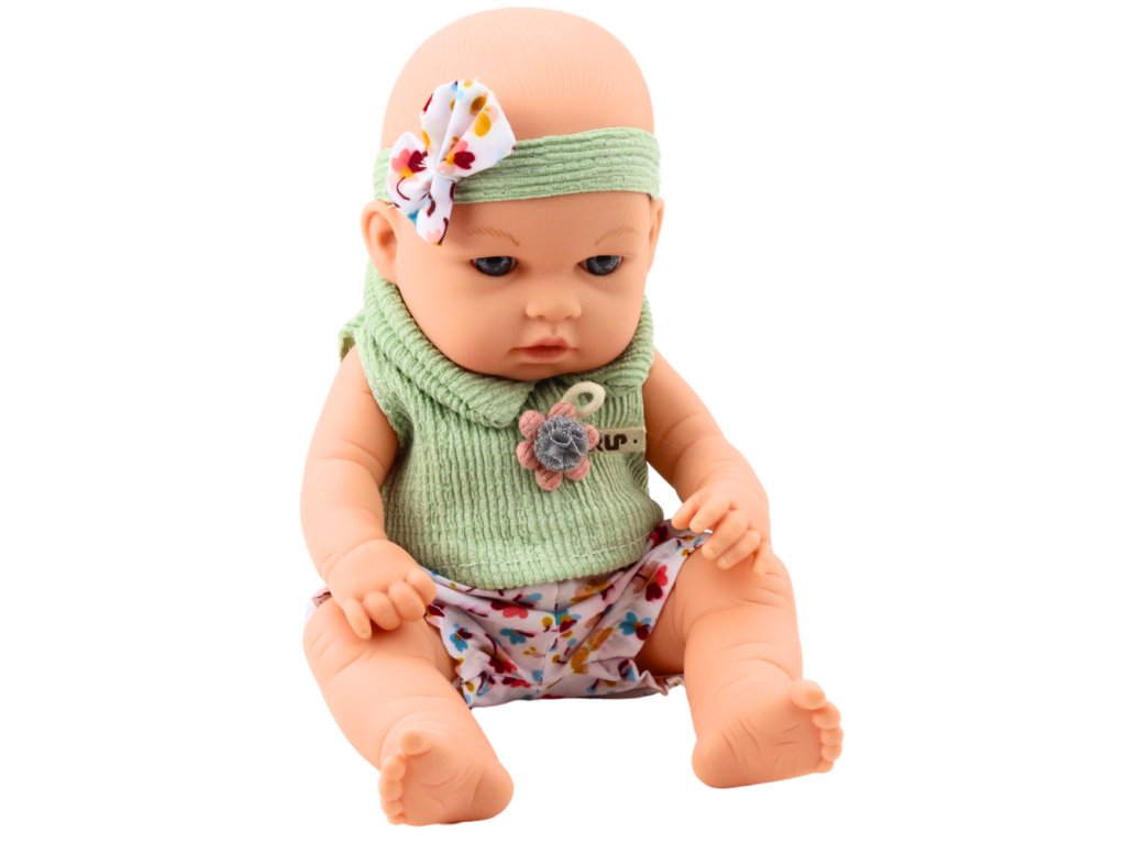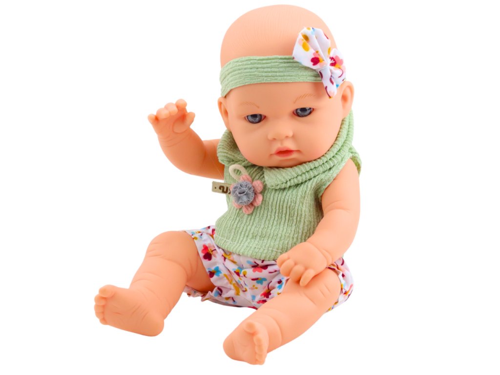 Panenka miminko v zeleném oblečení a květinové čelence je krásná, pečlivě zpracovaná hračka, která okouzluje přirozeným vzhledem, jemným úsměvem a dívčím, letním stylem Díky otevřeným očkům, jemným rysům obličeje a realistickým proporcím, připomíná tato panenka skvělým způsobem skutečné miminko, což pobízí dítě k laskavé a pečující hře, plné emocí a citového zapojení