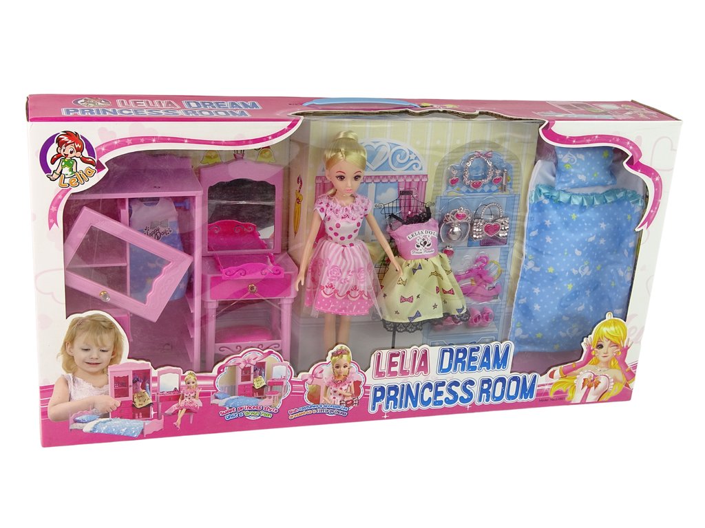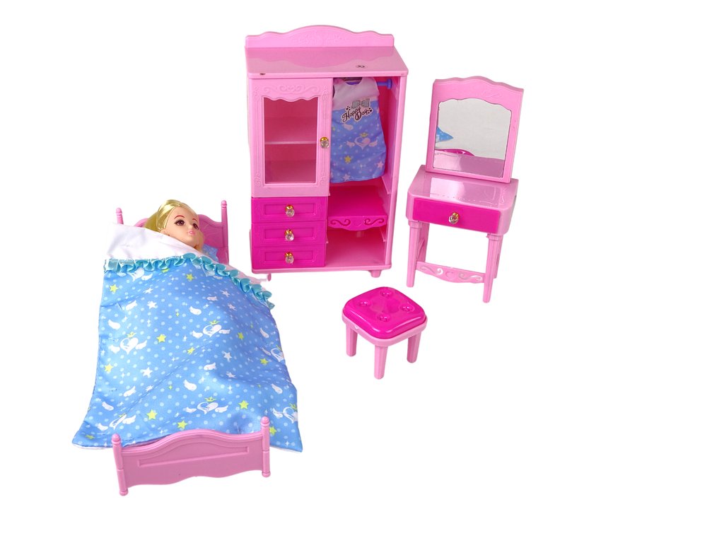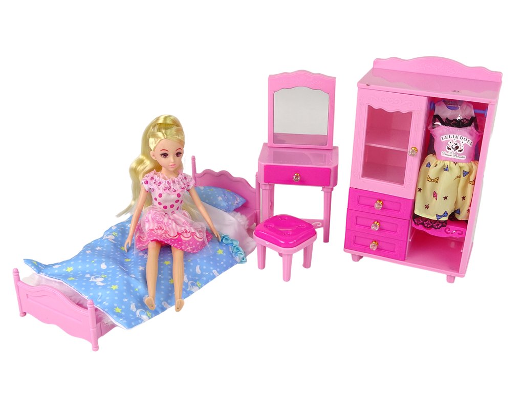 - Tato jedinečná sada obsahuje postel, šatní skříň, toaletní stolek a stoličku, všechny pečlivě navržené, aby dokonale doplnily panenkovou sbírku Vašich dětí