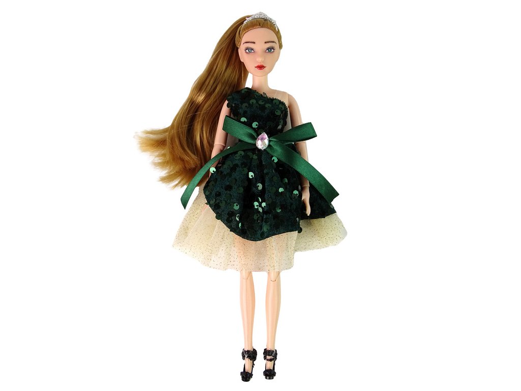 - Tato roztomilá panenka s elegantními šaty v barvě láhve zelené, zdobenými flitry a mašlí, okouzlí všechny malé fashionistky