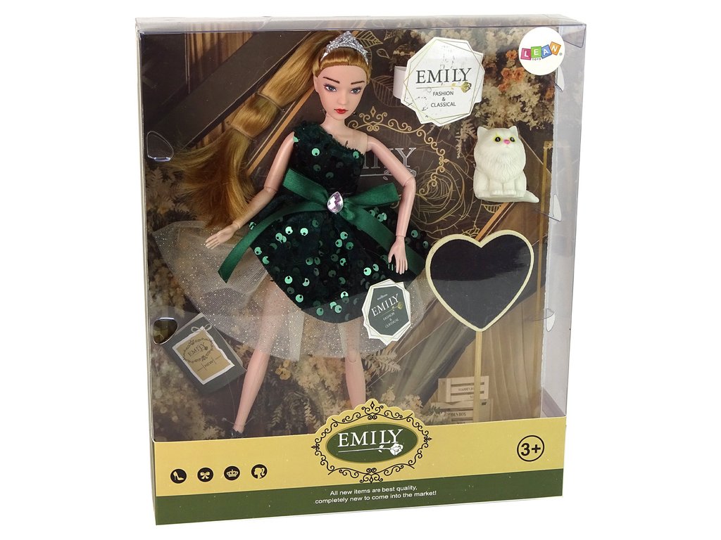 - Panenka pro děti Emily Dřevěné srdce Bílý koťátko Představujeme vám roztomilou panenku Emily s dlouhými blond vlasy, oblečenou v elegantních šatech v barvě láhve zelené, zdobených zelenými flitry a mašlí