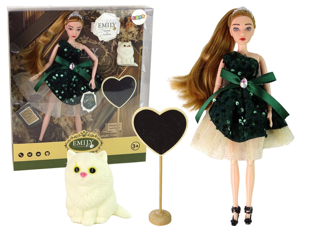 Panenka pro děti Emily Dřevěné srdce Bílý koťátko Představujeme vám roztomilou panenku Emily s dlouhými blond vlasy, oblečenou v elegantních šatech v barvě láhve zelené, zdobených zelenými flitry a mašlí.