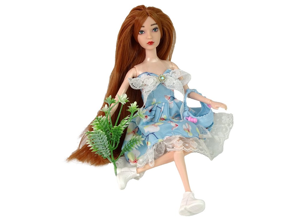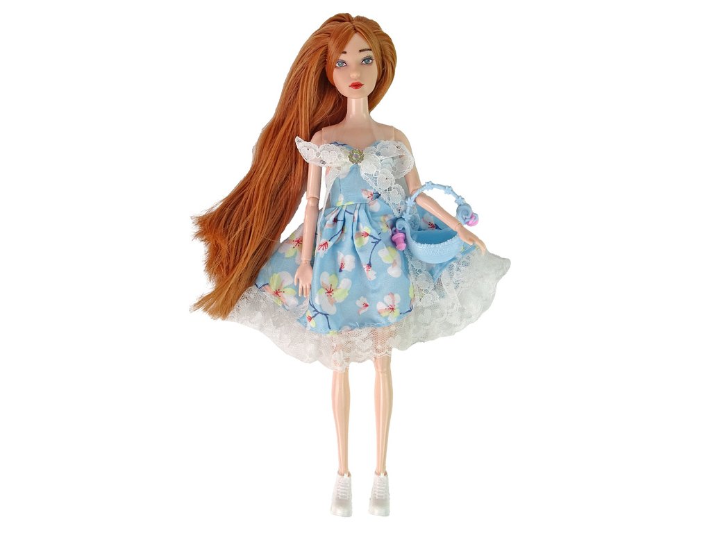 Zelené oči panenky dodávají jí šarm a jedinečnost Oblečená v krásných modrých šatech s jemným květinovým vzorem, zdobených srdíčkovou krajkou a roztomilou krajkovou mašlí