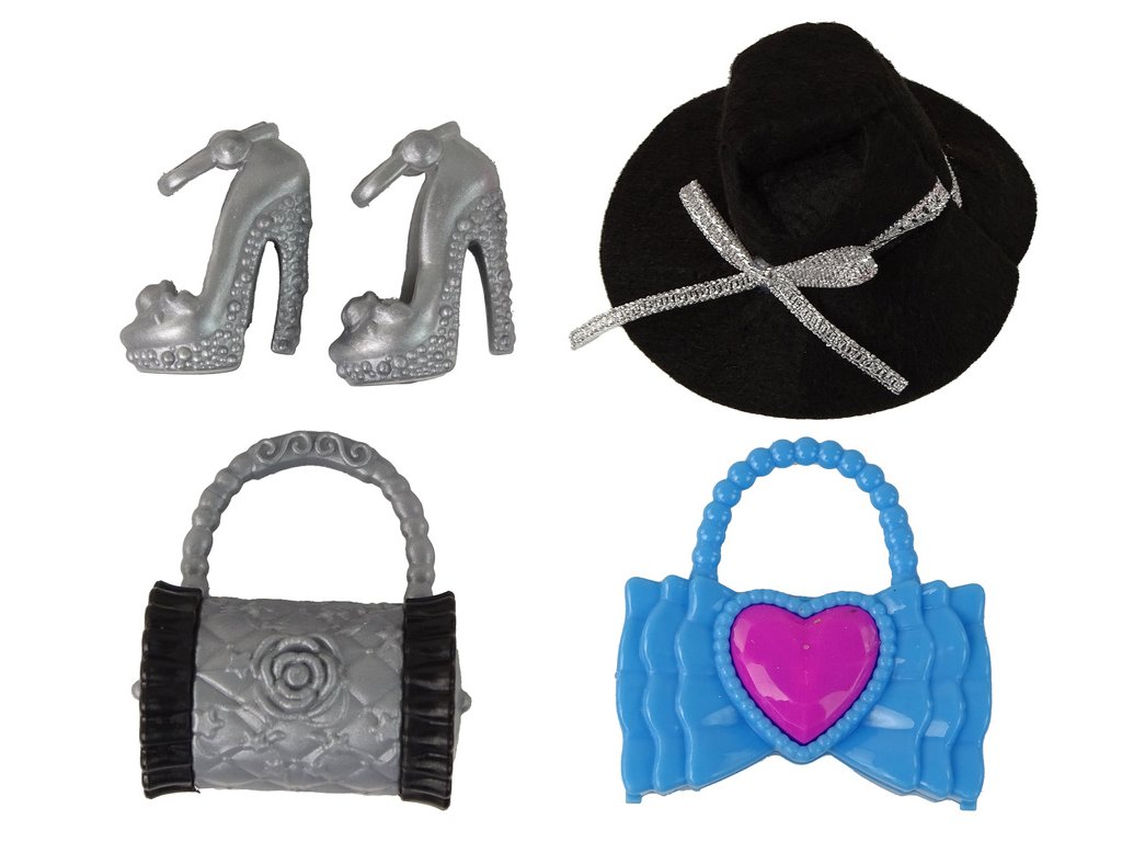 - V balení najdete širokou škálu doplňků, včetně elegantního černého klobouku, modré a šedé kabelky, a vyměnitelných šedých bot