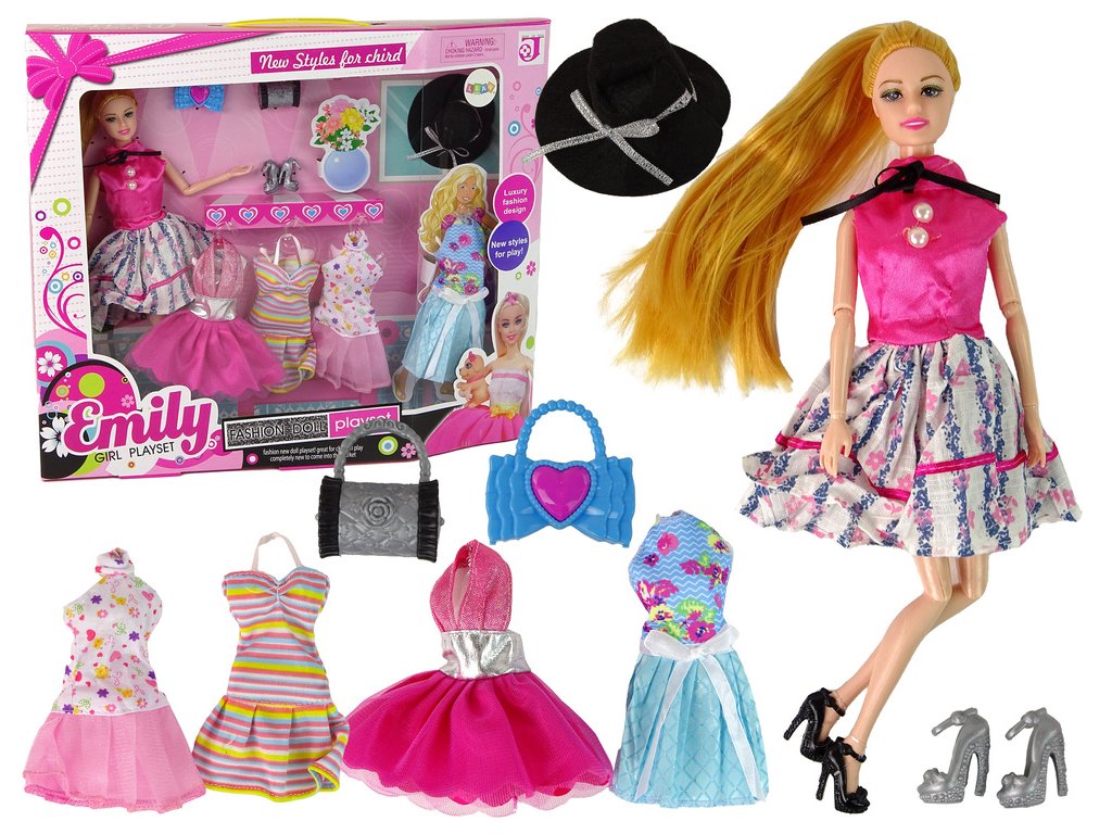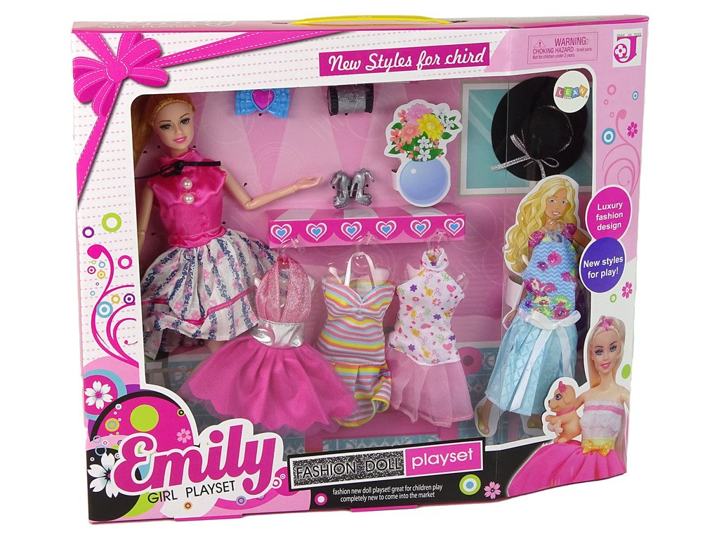 - Každý módní prvek panenky Emily je detailně propracovaný, ať už jde o večerní růžové šaty s brokátem, modré šaty s květinovými motivy nebo barevné pruhované šaty