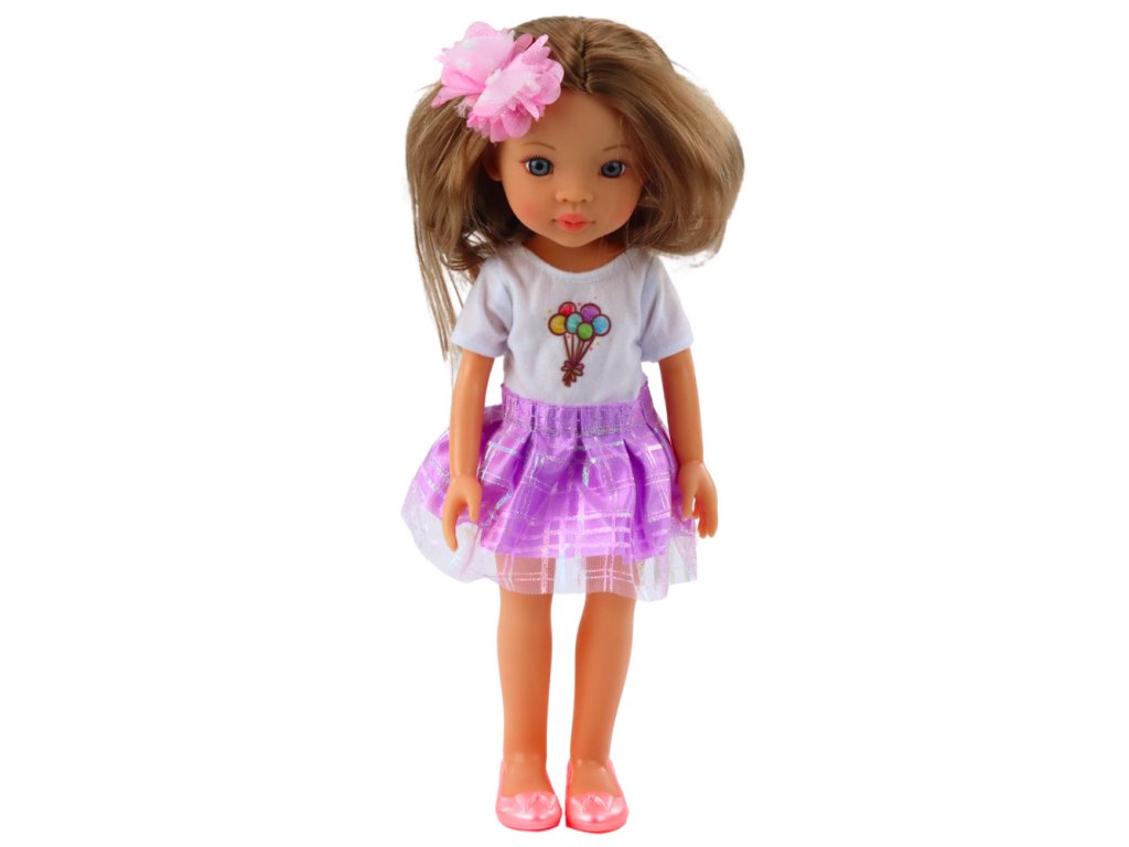 Vlasy jsou jemné a příjemné na dotek, zatímco růžová látková květina je jemným doplňkem, který dodává celé stylizaci dívčí půvab a lehkost Panenka Pretty Girl je oblečena v bílém tričku s barevným potiskem balónků, které dokonale ladí s tylovou, fialovou sukní s jemným leskem
