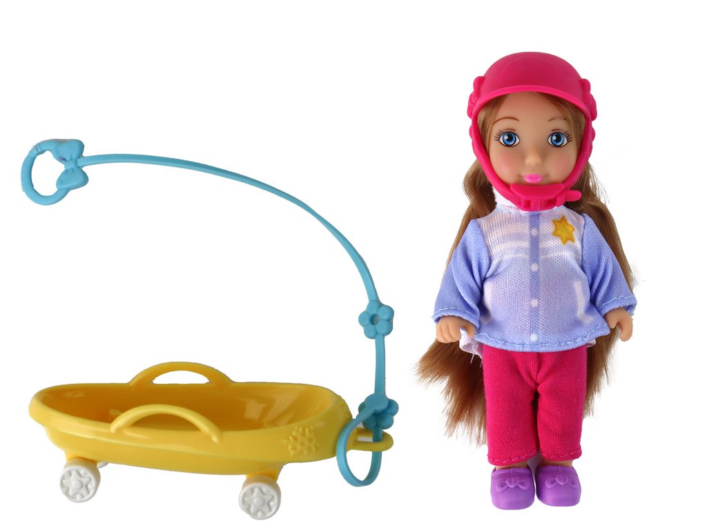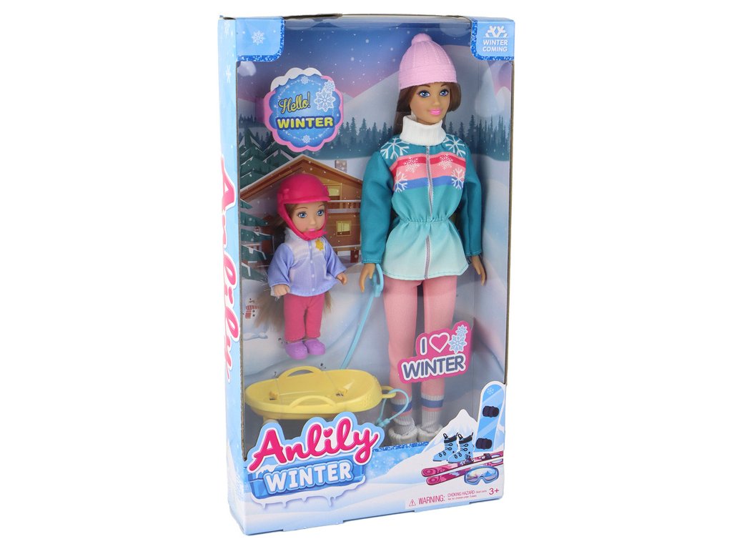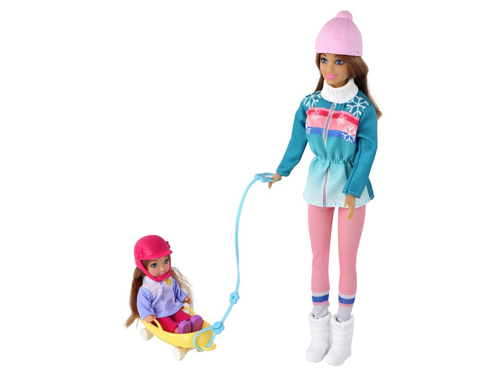 Panenky Anlily Mama s dcerou na saních, sada saní Panenka maminka s dcerou na saních je roztomilá sada, která zachycuje scénu zimní zábavy na sněhu Maminka má dlouhé hnědé vlasy, které se krásně vlní, a nosí růžovou čepici, která ji účinně chrání před chladem