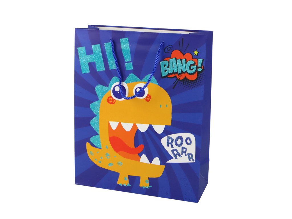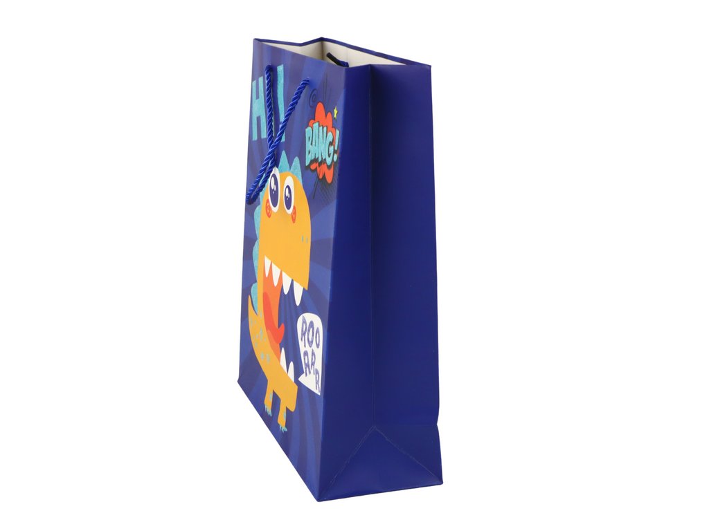- Papírová dárková taška tmavě modrá s dinosaurem 41,5 cm x 30 cm x 12 cm Tato dárková taška je díky motivu dinosaura mimořádně roztomilá a přitahuje pozornost