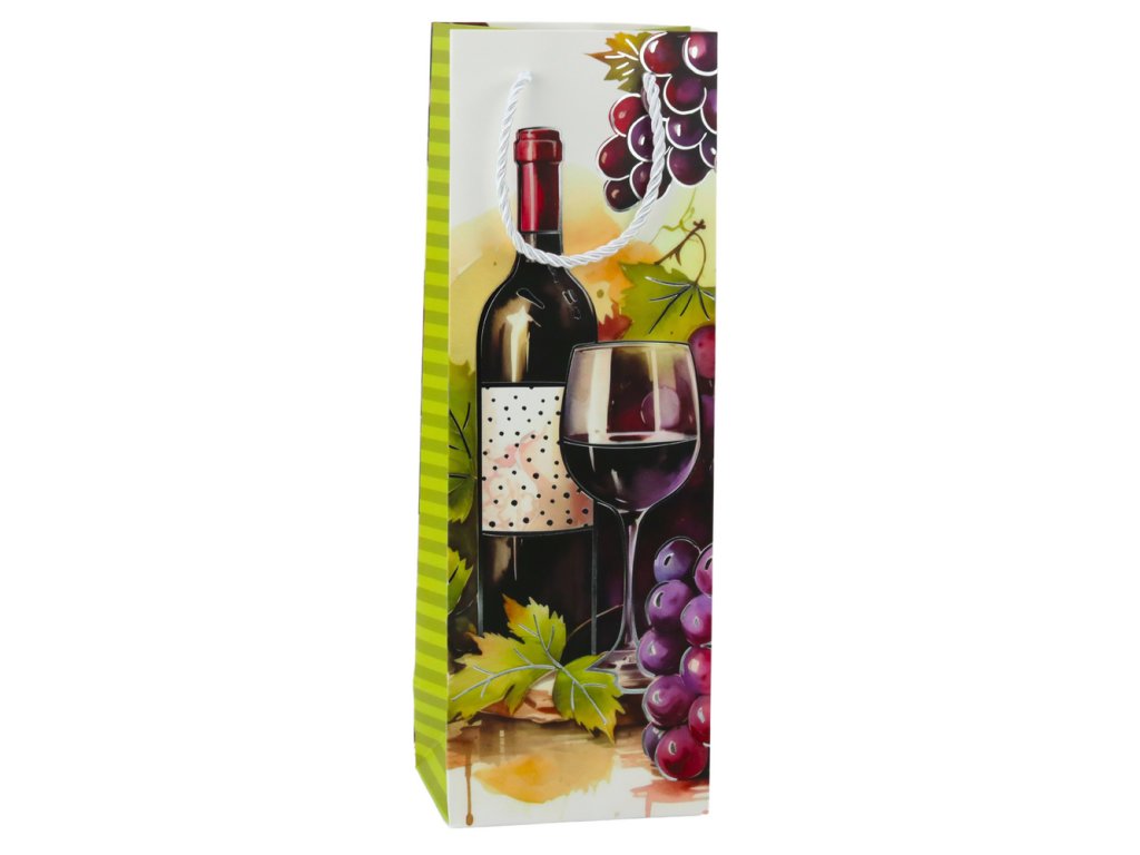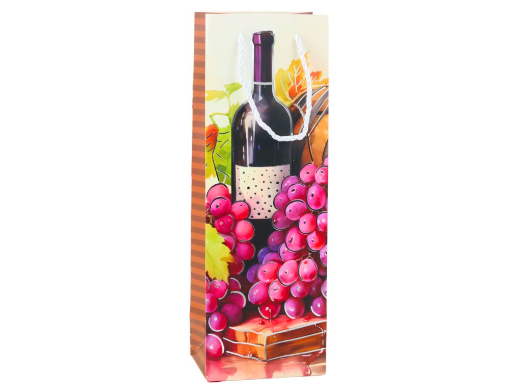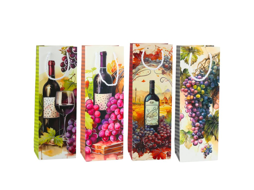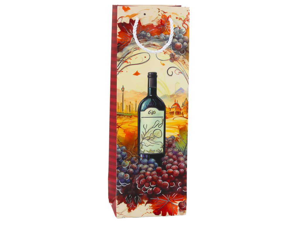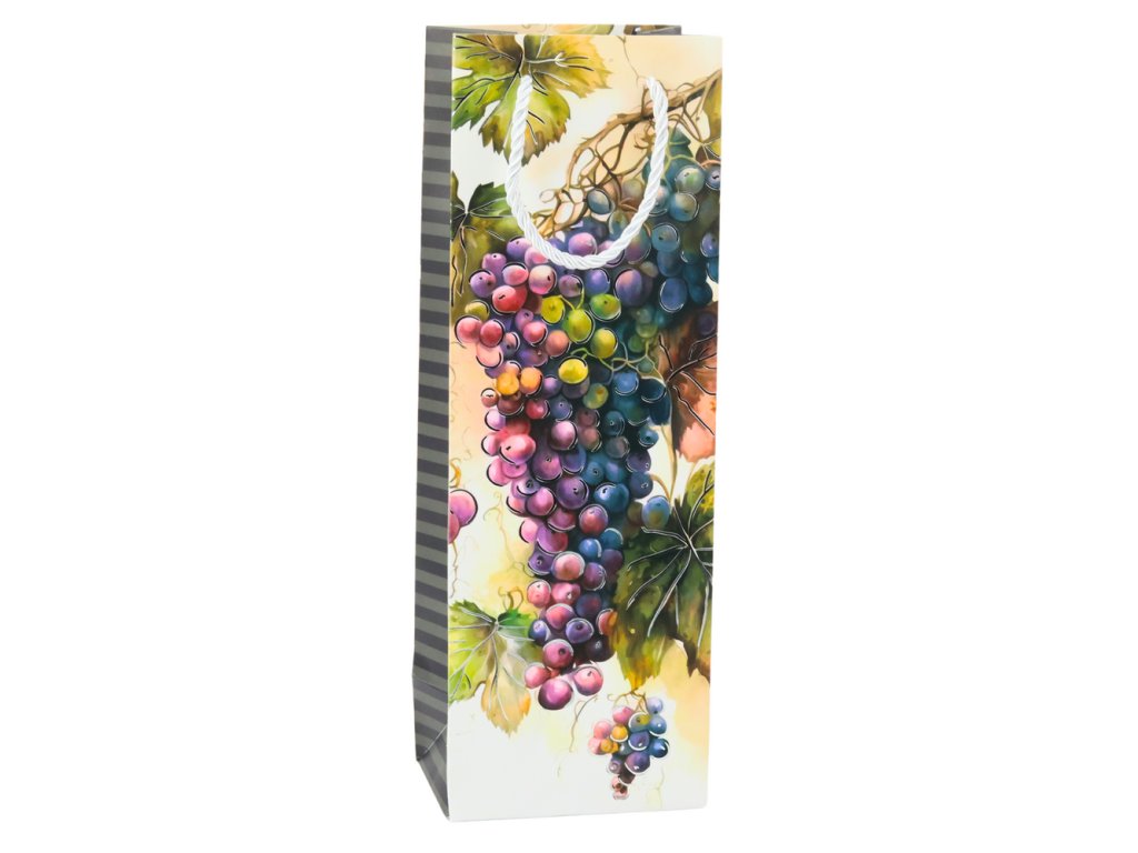 Elegantní dárková taška na víno je ideálním způsobem, jak zabalit lahev nápoje do výjimečného a stylového obalu Vyrobena z vysoce kvalitního, pevného papíru, vyniká krásnými, barevnými grafikami zobrazujícími vinnou révu, lahve vína a zralé hrozny