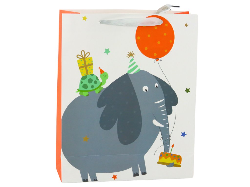 Papírová dárková taška s narozeninovým motivem slona Fantastická dárková taška navržená speciálně s ohledem na nejmenší! Její barevný a veselý design s motivem narozeninového slona a sympatické želvy je zárukou úsměvu na tváři každého dítěte