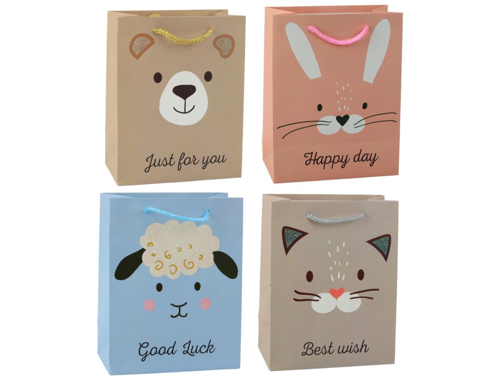 - Tato roztomilá dárková taška s motivem zvířátek je vyrobena z vysoce kvalitního papíru a vyniká okouzlujícími grafikami zvířátek: medvídka, králíčka, ovečky a kočky