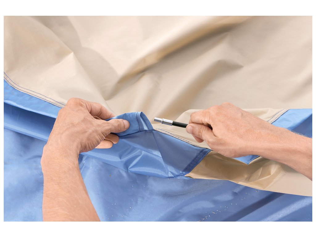 - Vyroben z lehkého, ale vysoce odolného materiálu, poskytuje ochranu před sluncem, větrem a mírným deštěm
