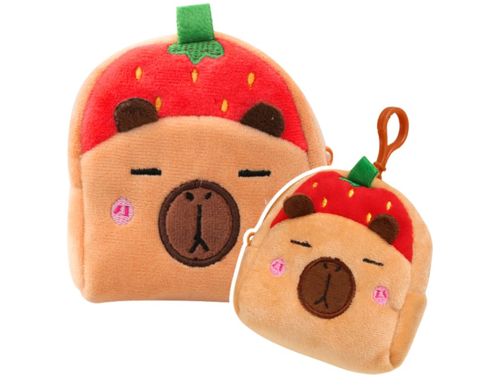 Pluszová Peněženka Kapibara s Červenou Jahodou a Klíčenkou, 9,5 x 8 cm