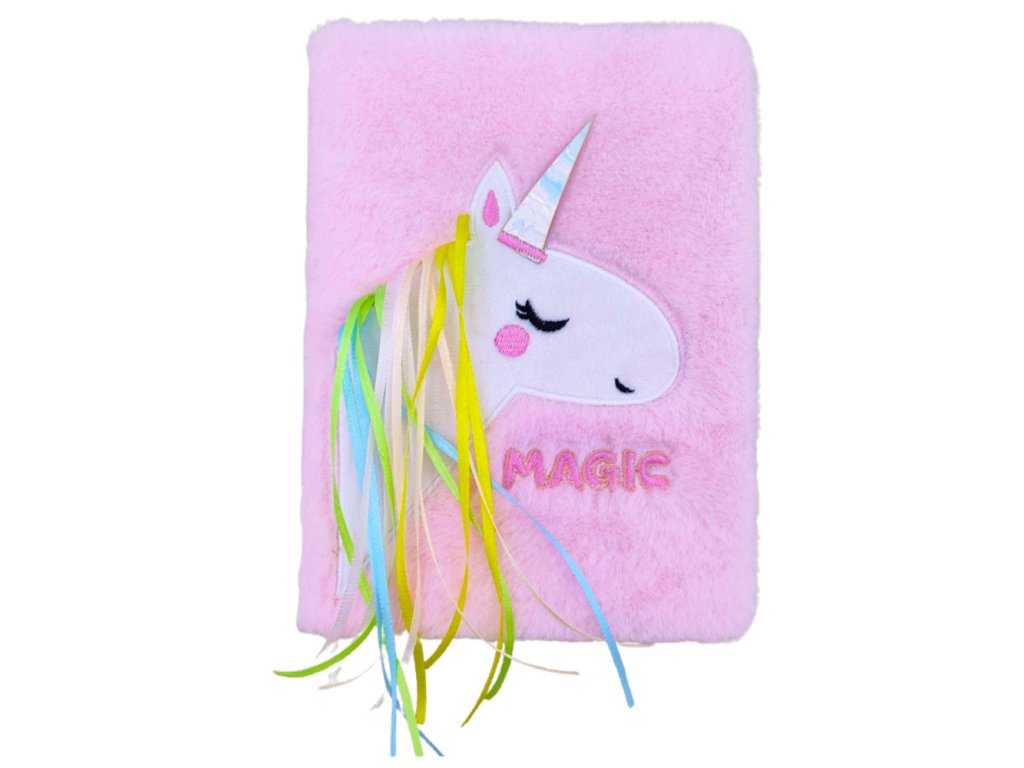 Pluszový zápisník s roztomilým motivem jednorožce s hřívou – barevný a stylový doplněk pro děti, mládež a milovníky výjimečných gadžetů.