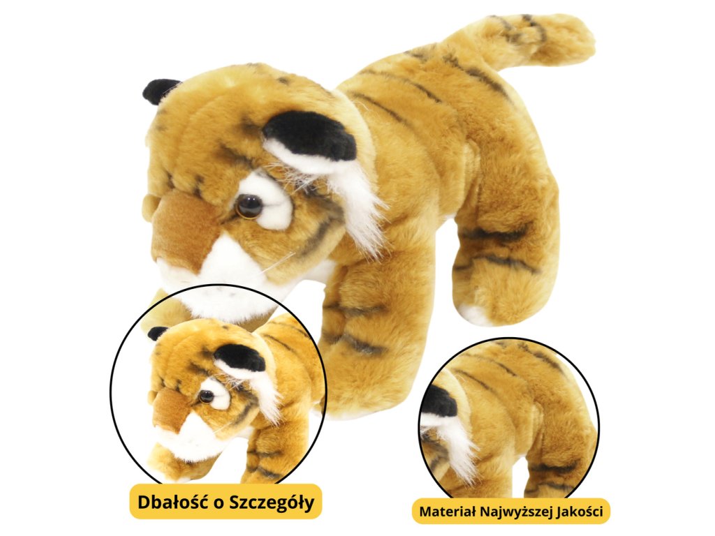 Plyšový tygr je výjimečný mazlíček, který uchvátí jak děti, tak dospělé svým realistickým vzhledem a mimořádnou měkkostí zpracování Hračka je ušitá z vysoce kvalitního plyše s příjemnou, hustou strukturou, což činí její dotýkání skutečným potěšením