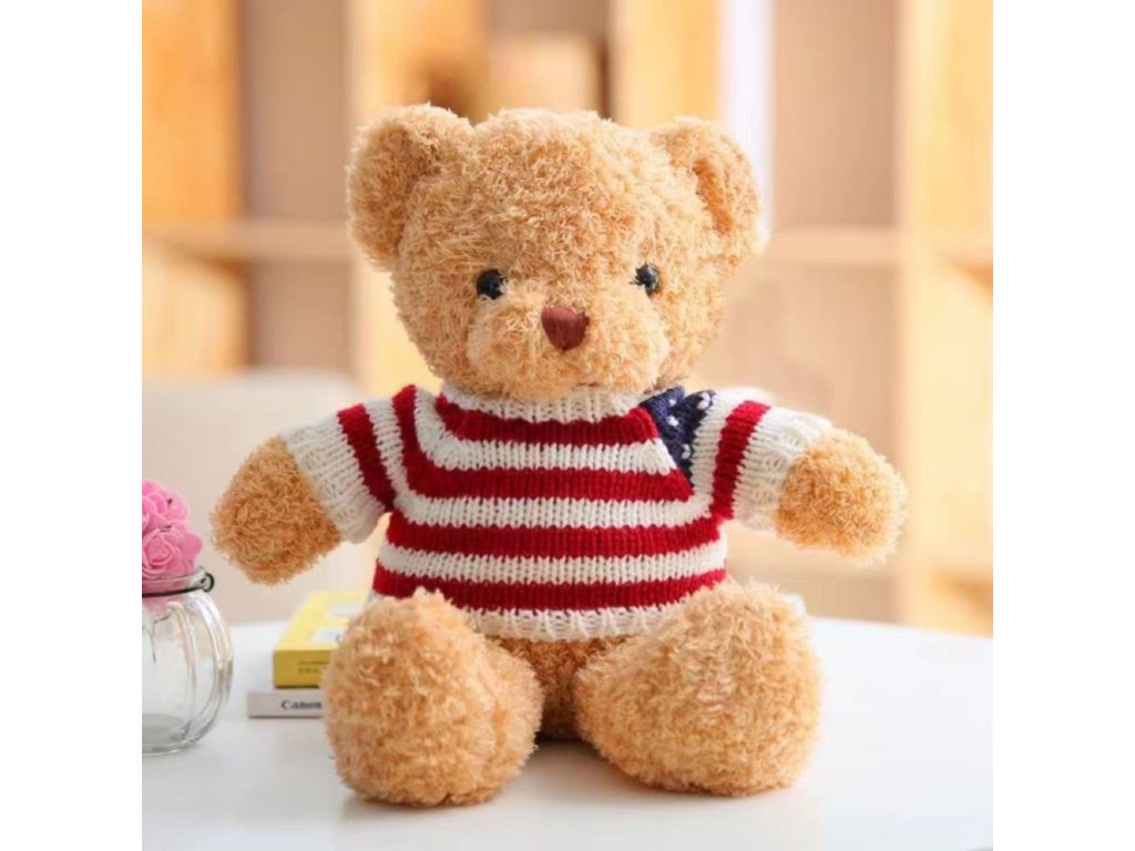 Jeho přátelsky vyhlížející obličej a pohodlný tvar ho předurčují k mazlení i zábavě Medvídek oblečený v svetru s pruhy a nášivkou je nejen kamarádem ke spaní, ale také atraktivním společníkem dětských dobrodružství