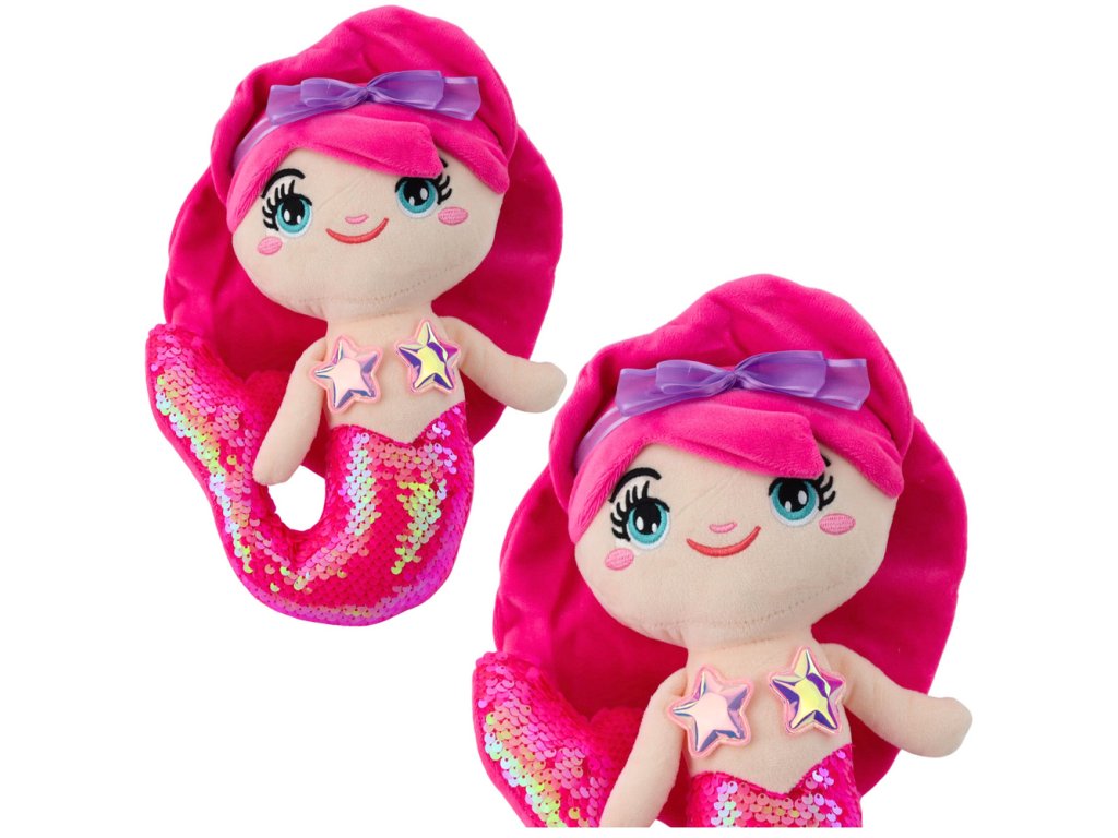 - Plyšová mořská panna v intenzivně růžovém provedení je okouzlující a efektní hračka, která zaujme svým vzhledem a smyslovým efektem měnících se flitrů