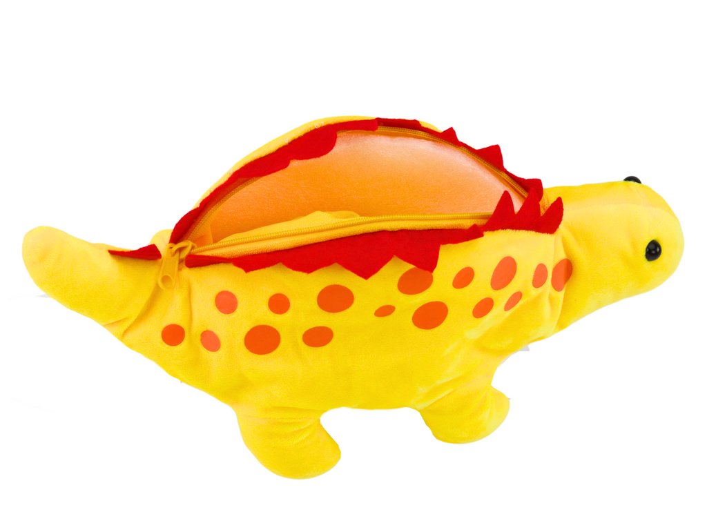 Plušový Dinozaur Pouzdro Úložný Přívěsek Žlutý Plušový dinosaurus v žluté barvě s červenými prvky je výjimečný a všestranný plušák, který určitě přitahne pozornost každého dítěte Vyrobená z měkkého a příjemného na dotek materiálu, poskytuje dodatečný komfort během hry i mnoho praktických funkcí