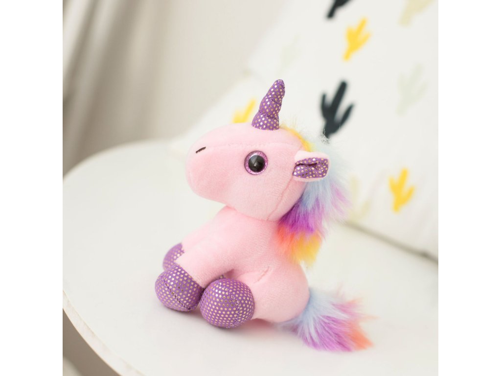Vyrobený z příjemného na dotek růžového plyše, zaujme svým vzhledem s třpytivými fialovými detaily, měkkou hřívou a ocasem v duhových barvách a lesklým rohem Je to miniaturizovaná verze jednorožce a vzbuzuje sympatii u dětí i dospělých