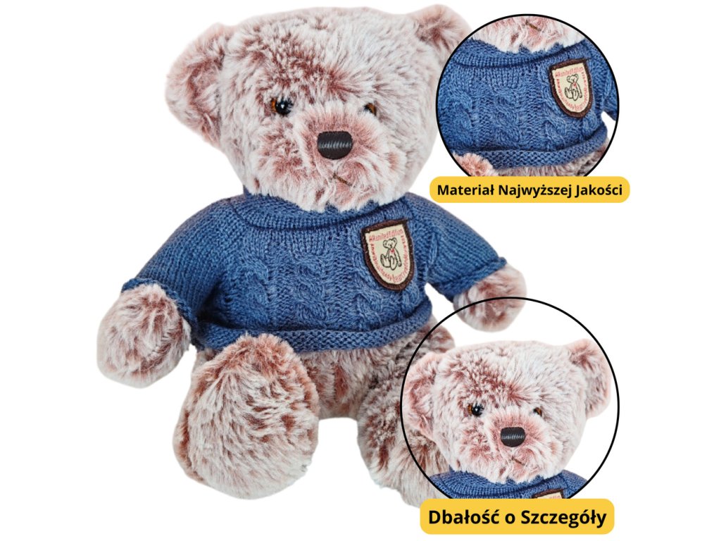 - PLYŠOVÝ MEDVÍDEK V MODRÉM SVETŘÍKU 21CM Plyšový medvídek v modrém svetříku je klasická a zároveň mimořádně roztomilá hračka, která dokonale spojuje nadčasové kouzlo tradičních plyšáků s estetickým a stylovým akcentem