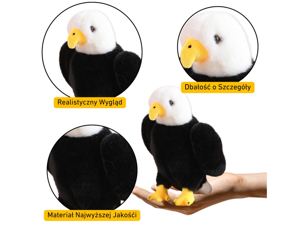 Plyšový orel vysoký 25 cm, vyrobený v klasické černo-bílé barevné kombinaci Tato maskotka je vynikajícím výběrem pro děti, které se zajímají o ptáky