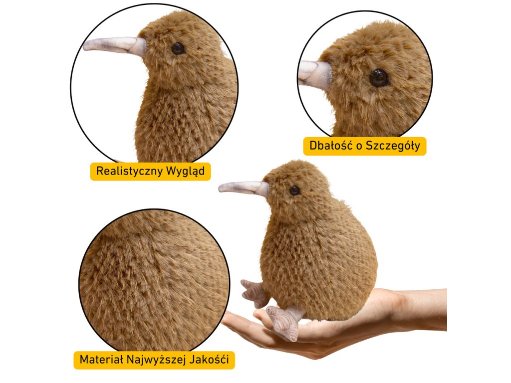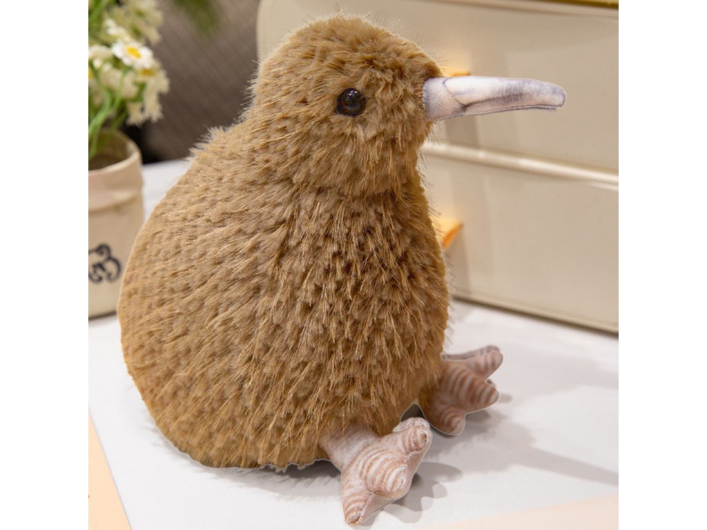- Plyšová hračka kiwi o výšce 17 cm, věrně napodobující charakteristické světle hnědé peří tohoto unikátního ptáka