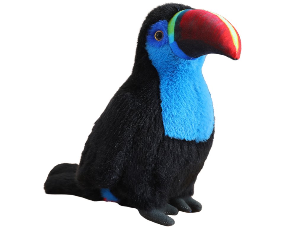 Tento plyšový tukan o výšce 35 cm věrně zobrazuje charakteristická černá peříčka s modrými akcenty.