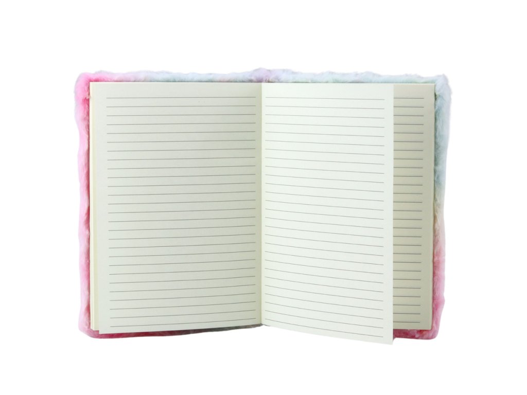 - Obal je pokryt vícebarevným, pastelovým plyšem, který produkt odlišuje od klasických papírenských výrobků