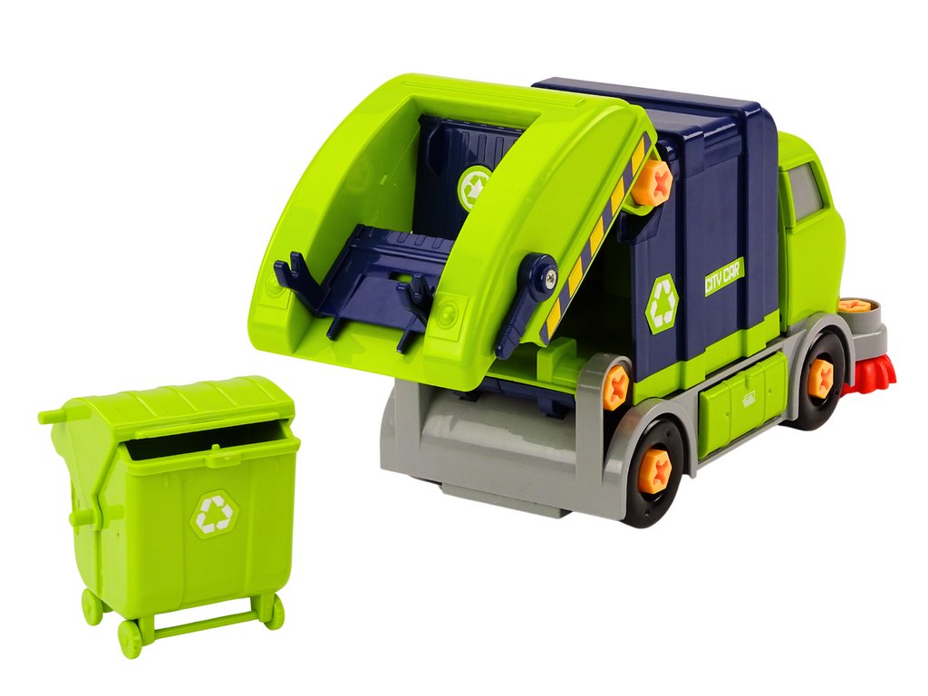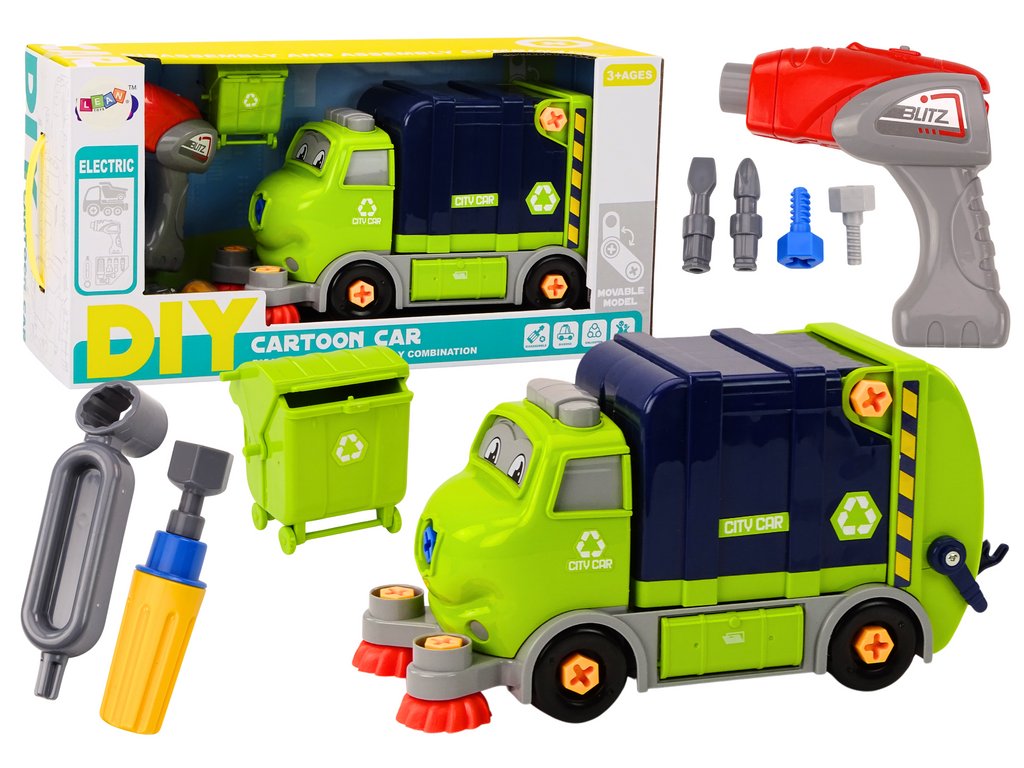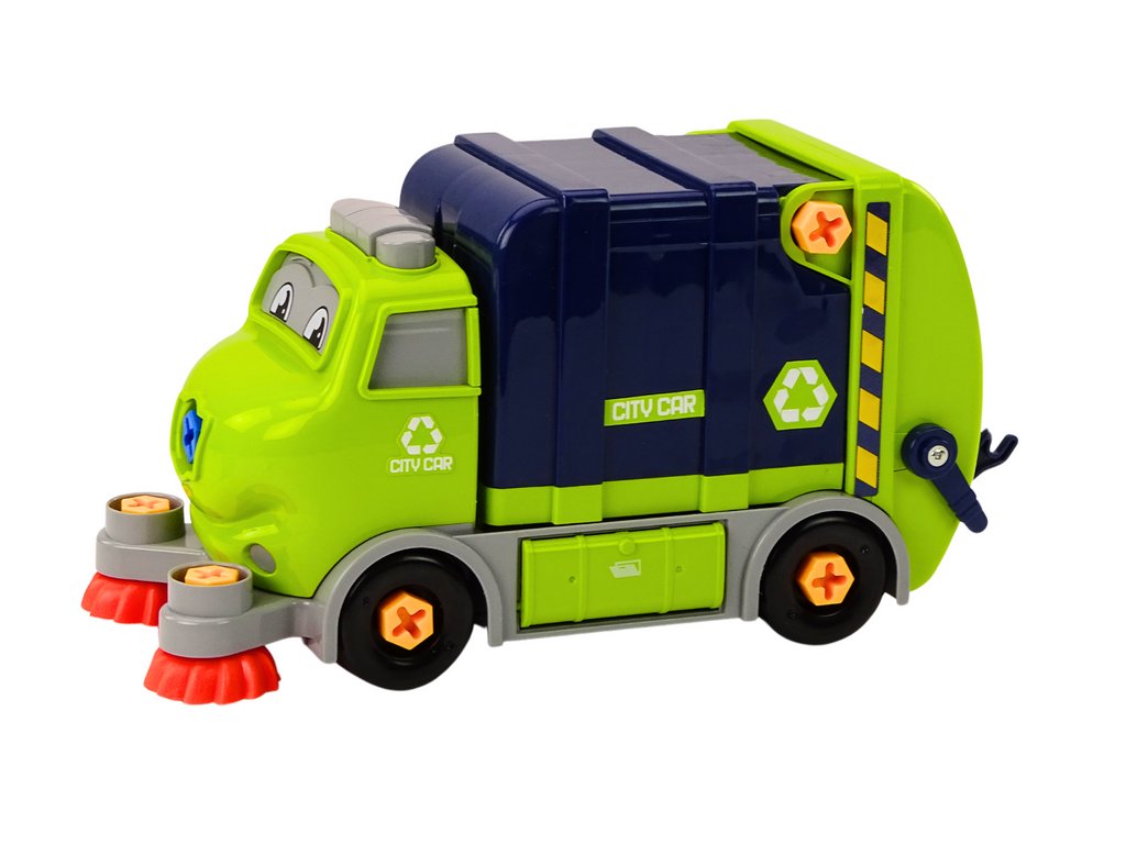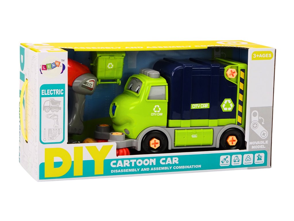 Autíčko na odpad kreslené ke skládání, pohyblivé DIY modré je fantastická hračka, která dá šanci každému chlapci proměnit se v malého mechanika a objevitele světa velkých strojů