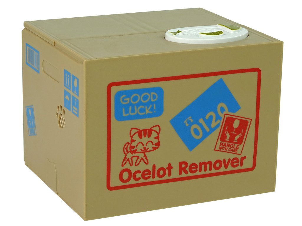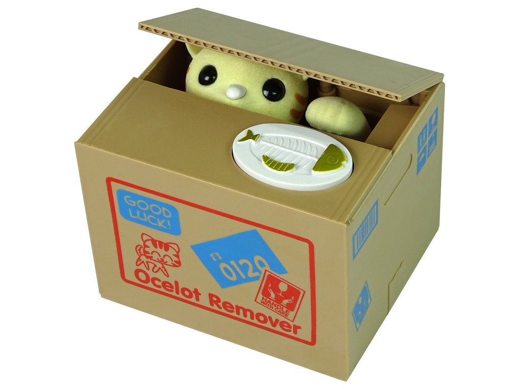 - Stiskněte tlačítko na budce a kočka zvedne víko a tlapkou vtáhne minci