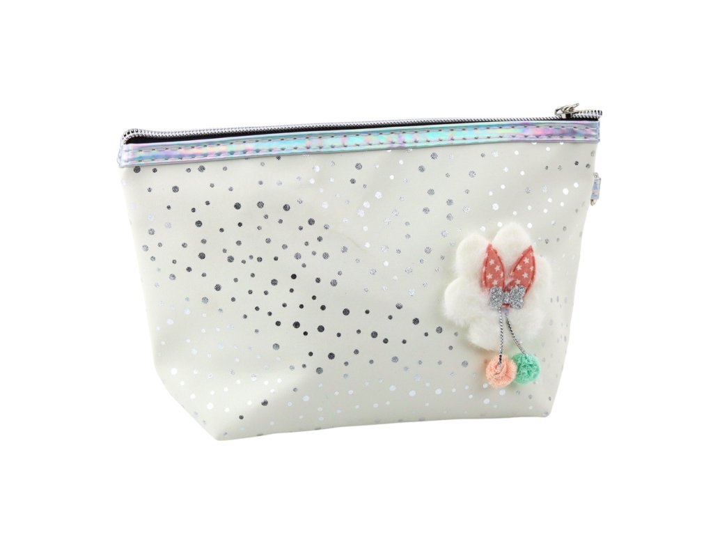- Bílý Penál-Kosmetická Taška s Ozdobným Pomponem a Mašličkovým Motivem Stylový a funkční penál-kosmetická taška v bílé barvě s třpytivým povrchem je praktickým doplňkem jak do školy, tak pro každodenní použití