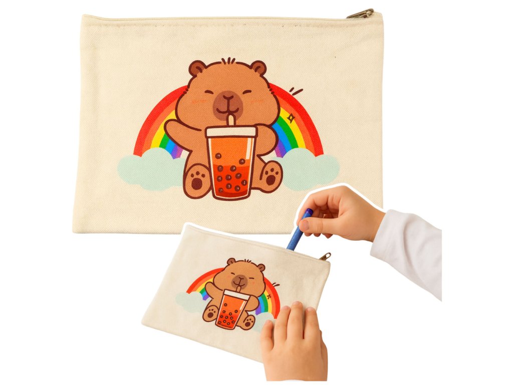 Kosmetická taška Kapibara na zip je vaším novým oblíbeným pomocníkem pro organizaci každodenních drobností. Tento praktický a roztomilý doplněk je ideální pro ukládání kosmetiky, školních potřeb a různých drobností. Vyrobena z odolného a příjemného materiálu, zaručuje pohodlné a bezpečné používání. Díky lehkému a kompaktnímu designu ji snadno vkložíte do batohu, kabelky nebo stolu. Unikátní design s kapibarou pijící bubble tea v deštivé duhové kulise dodává tašce kouzelný vzhled, který uchvátí děti, mladé i milovníky sladkých pastelových ilustrací.