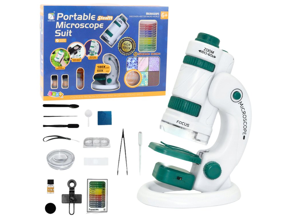 Přenosný vzdělávací mikroskop pro děti 2v1 60X/180X s příslušenstvím je ideální sada pro malé vědce, kteří chtějí objevovat fascinující svět mikrobiologie.