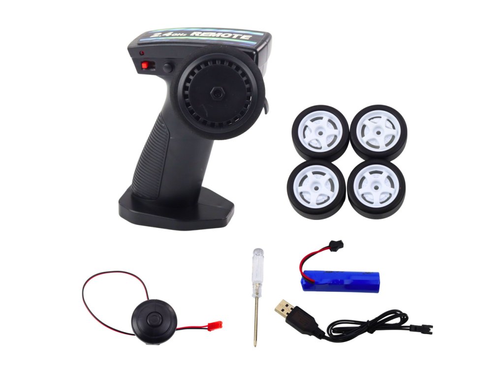 - Kompletní sada: Obsahuje auto, 7.4V Li akumulátor, USB kabel pro nabíjení, sadu kol na drift, 2.4G ovladač a šroubovák