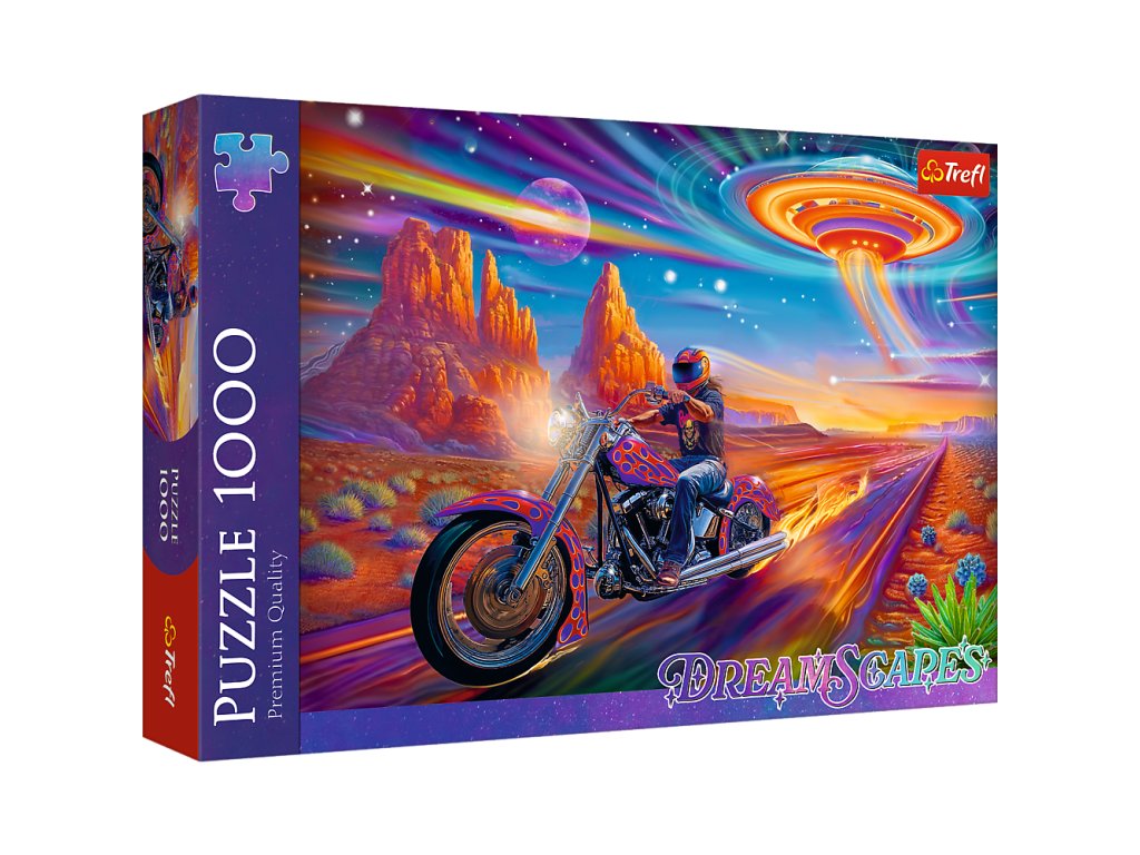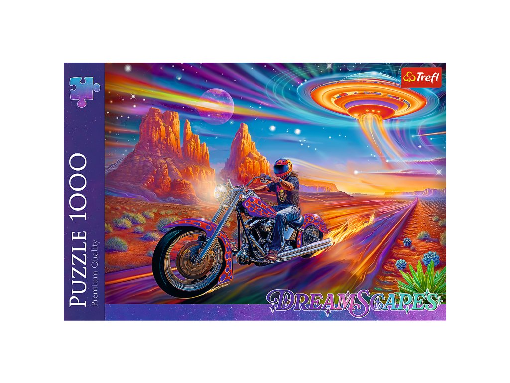Bláznivá jízda FSC Mix 70% 10930 je součástí série DreamScapes, která vás zavede do surrealistického světa snů plného intenzivních barev Tyto puzzle s názvem Bláznivá jízda obsahují 1000 dílků a zobrazují motorkáře řítícího se přes pouštní dálnici, nad kterou se vznáší kosmická loď